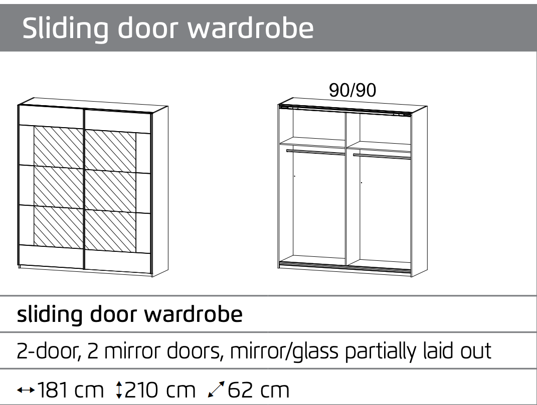 Behind the smooth-gliding doors are 2 internal compartments (each 90cm wide), offering 2 adjustable shelves and 2 hanging rails, allowing you to customise the layout to suit your storage needs. Whether you’re organising suits, dresses, or everyday wear, this wardrobe is built to make life simpler and more stylish.