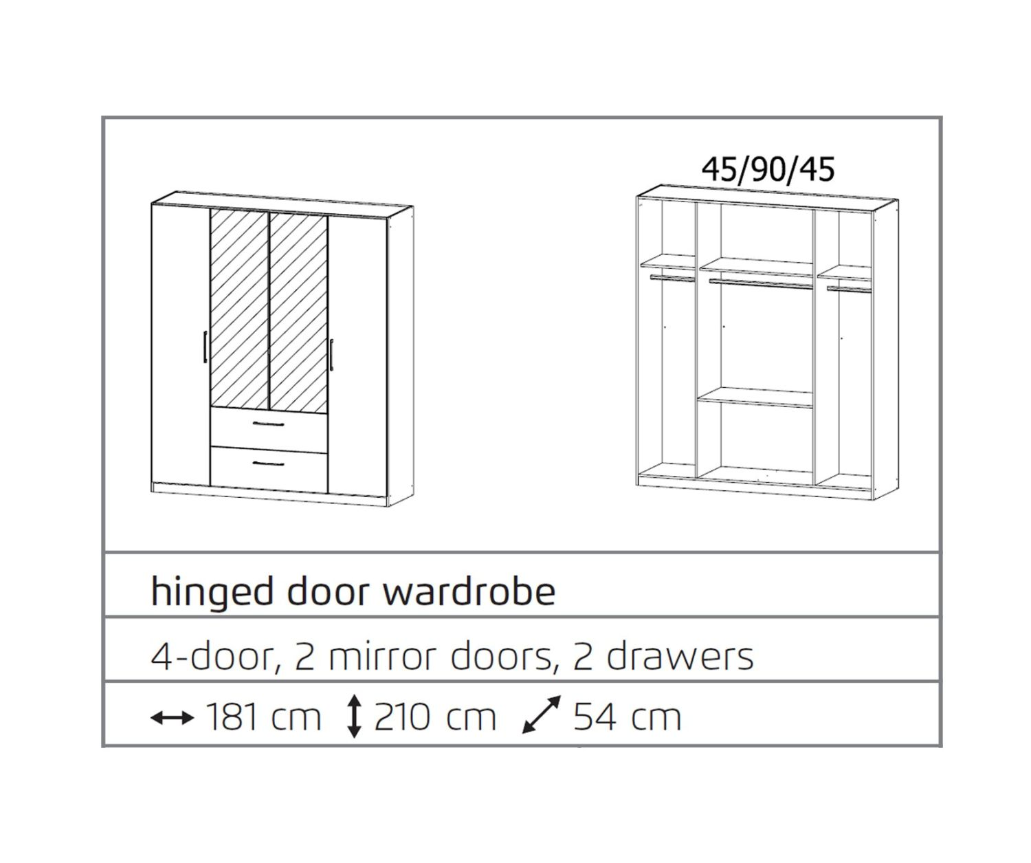 The layout features four hinged doors, two of which have full-length mirrors — perfect for dressing and for enhancing the light and sense of space in your room. Inside, the wardrobe includes a full-length hanging rail for clothing and ample internal space for garments and accessories.