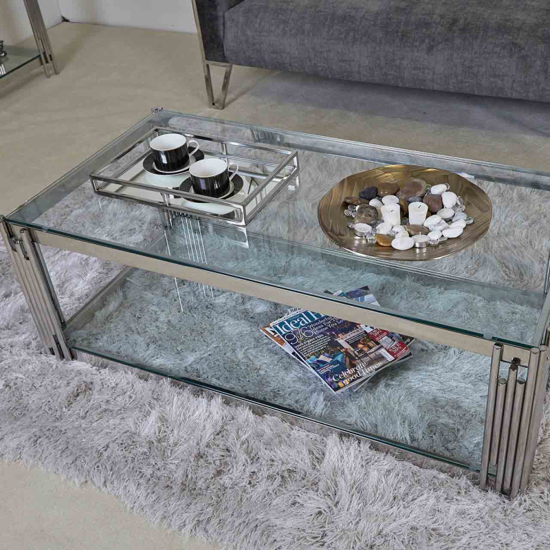 The Coven Table Collection showcases a stunning tubular stainless steel frame, available in Shiny Gold or Shiny Chrome. Each piece is topped with a clear tempered glass surface and complemented by a lower glass shelf, offering both style and practicality. With its sleek lines and modern finish, the Coven range brings a touch of timeless elegance to any interior.