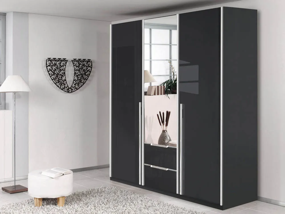 The Marina Wardrobe offers a perfect blend of hanging, shelving, and drawer storage in a stylish modern design. Its mirrored centre panel brightens the room while the basalt glass and metallic grey finish bring a luxurious feel to your bedroom.