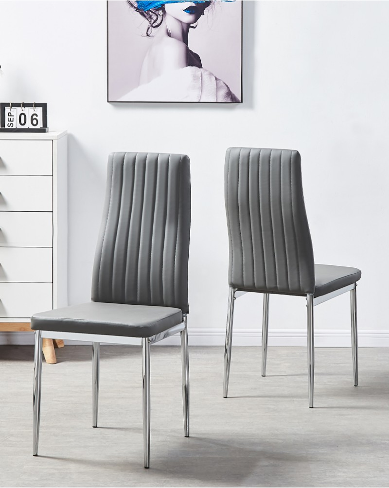 Paired perfectly with the table are the Pearl  Dining Chairs, combining chic design with superior comfort. Upholstered in soft, luxurious faux leather, these chairs offer ergonomic high backs for excellent support. Their durable chrome-finished legs come with anti-scratch plastic feet to protect your flooring while providing solid stability. This stylish dining set effortlessly merges function with sophistication for your home.